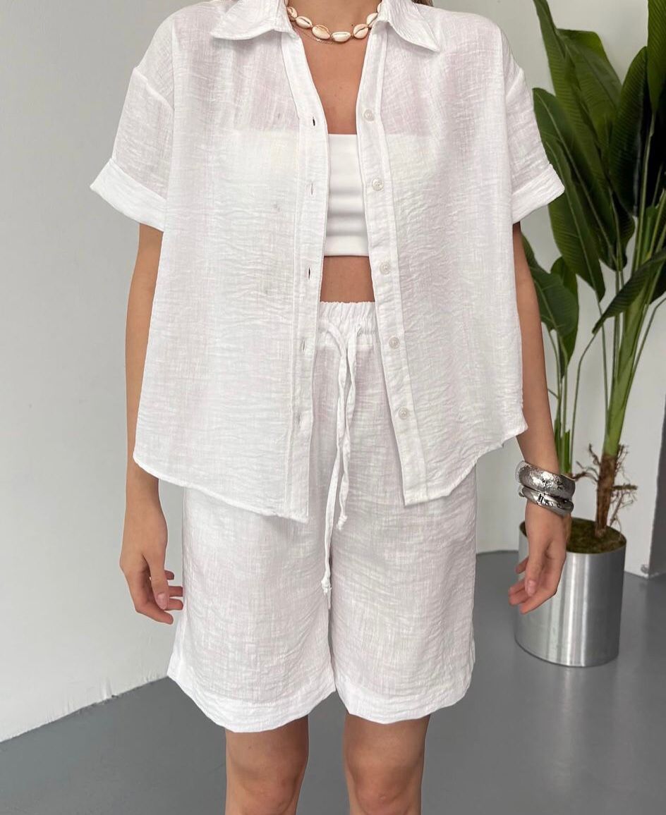 Compleu casual format din camasa usor transparenta cu nasturi si pantaloni scurti cu siret, perfect pentru zilele calde. Confortabil si stilat, ideal pentru un look relaxat.