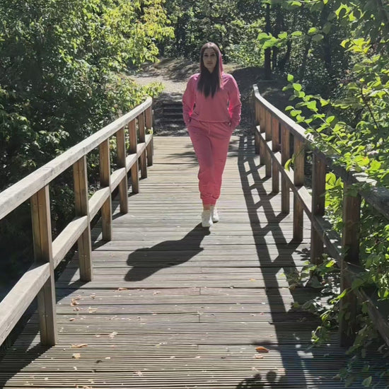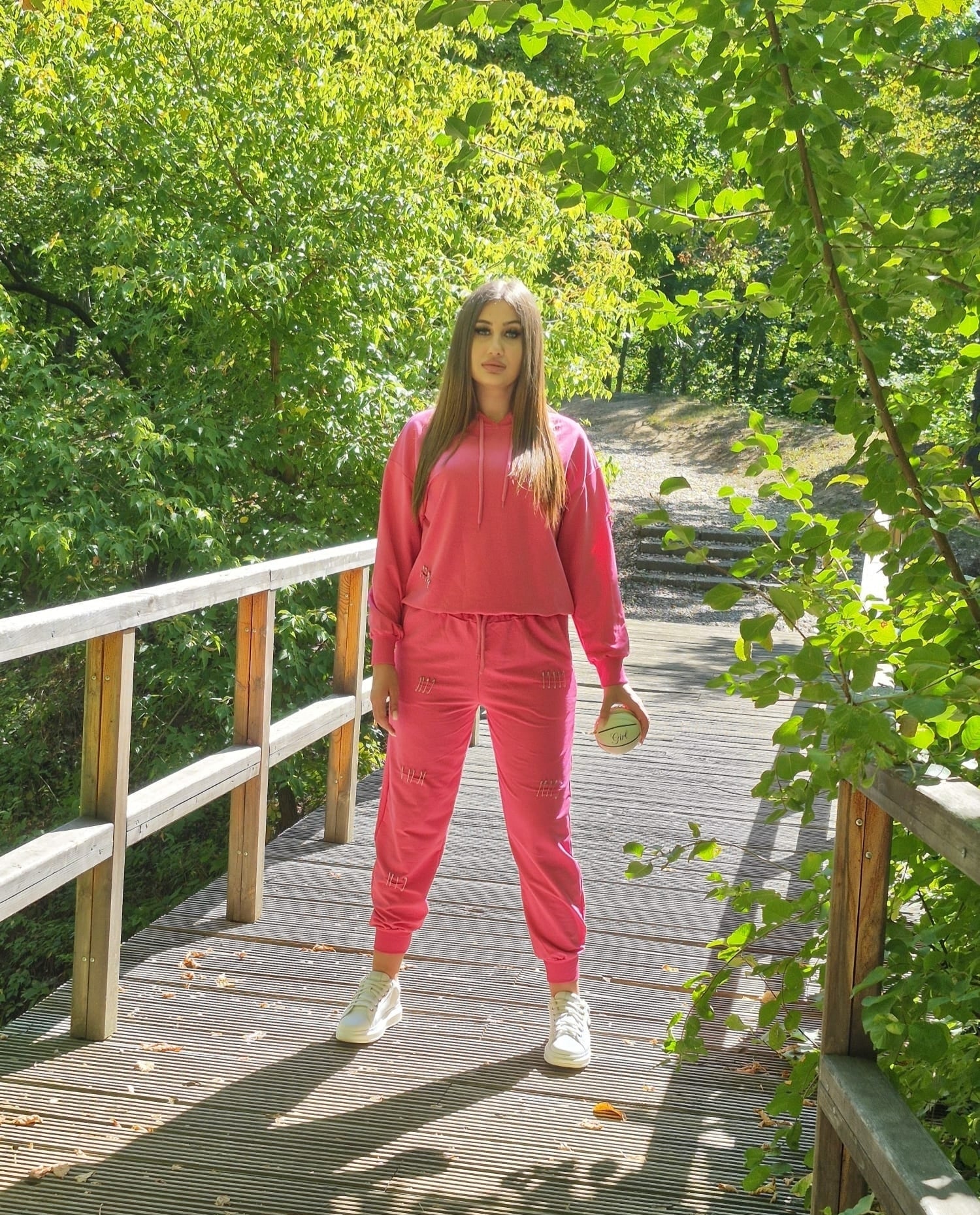 Compleu sport roz din doua piese, format din hanorac cu gluga si pantaloni sport. Piesa se remarca prin detaliile originale: taieturi decorative si accesorii cu ace de siguranta, ce adauga un vibe urban si indraznet.