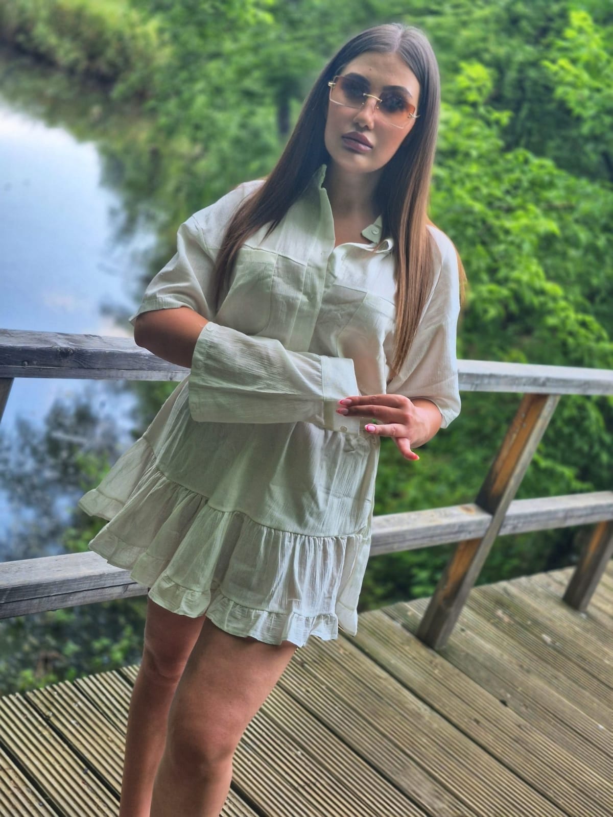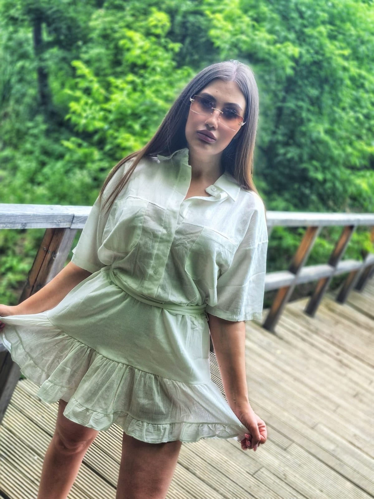Rochie din muselina lejera si vaporoasa, perfect pentru zilele calduroase. Design versatil: manecile pot fi purtate sau indepartate, transformand rochia dintr‑una cu maneca lunga intr‑una cu maneca tip tricou. Prinderea manecii se face cu nasturi Prindere frontala cu nasturi discrete, care permit ajustarea usurinta a decolteului. Cordon subtire in talie, care pune in valoare silueta si controleaza volumul fustei. Fusta are o croiala evazata, cu volane suprapuse delicate, creand un efect fluid si romantic. Lungime mini, care pune in evidenta picioarele si confera un aer tineresc si feminin.