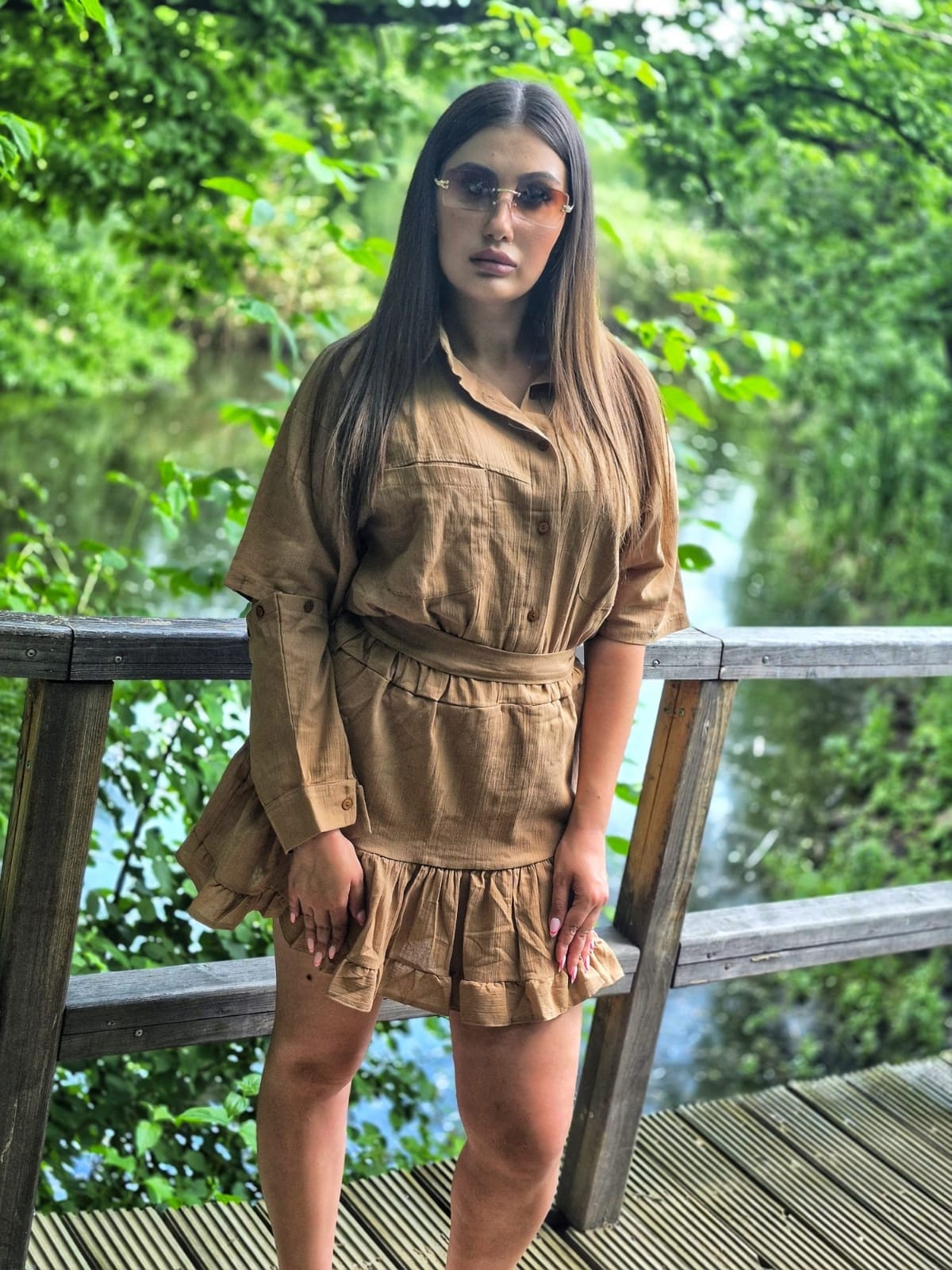 Rochie din muselina lejera si vaporoasa, perfect pentru zilele calduroase. Design versatil: manecile pot fi purtate sau indepartate, transformand rochia dintr‑una cu maneca lunga intr‑una cu maneca tip tricou. Prinderea manecii se face cu nasturi Prindere frontala cu nasturi discrete, care permit ajustarea usurinta a decolteului. Cordon subtire in talie, care pune in valoare silueta si controleaza volumul fustei. Fusta are o croiala evazata, cu volane suprapuse delicate, creand un efect fluid si romantic. Lungime mini, care pune in evidenta picioarele si confera un aer tineresc si feminin.