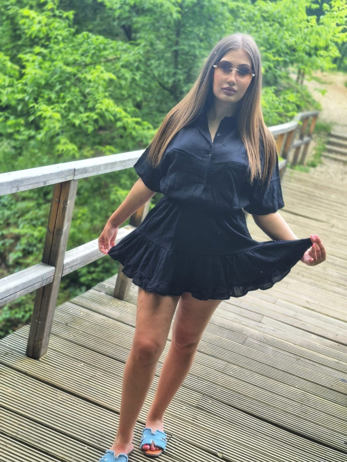 Rochie din muselina lejera si vaporoasa, perfect pentru zilele calduroase. Design versatil: manecile pot fi purtate sau indepartate, transformand rochia dintr‑una cu maneca lunga intr‑una cu maneca tip tricou. Prinderea manecii se face cu nasturi Prindere frontala cu nasturi discrete, care permit ajustarea usurinta a decolteului. Cordon subtire in talie, care pune in valoare silueta si controleaza volumul fustei. Fusta are o croiala evazata, cu volane suprapuse delicate, creand un efect fluid si romantic. Lungime mini, care pune in evidenta picioarele si confera un aer tineresc si feminin.