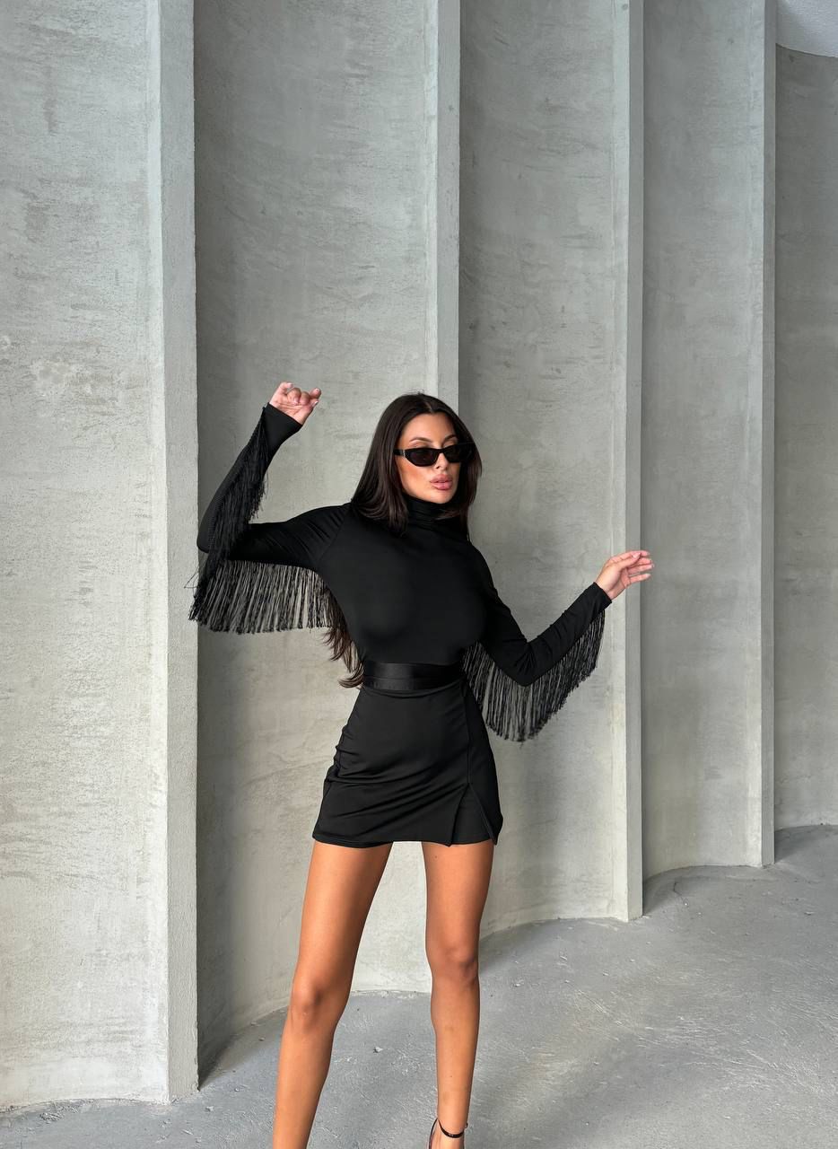 Salopeta tip fusta-pantalon, realizata din barbi si lycra, cu maneci lungi decorate cu franjuri. Designul modern si materialele de calitate ofera un look sofisticat si confortabil, ideal pentru evenimente speciale sau aparitii de impact.