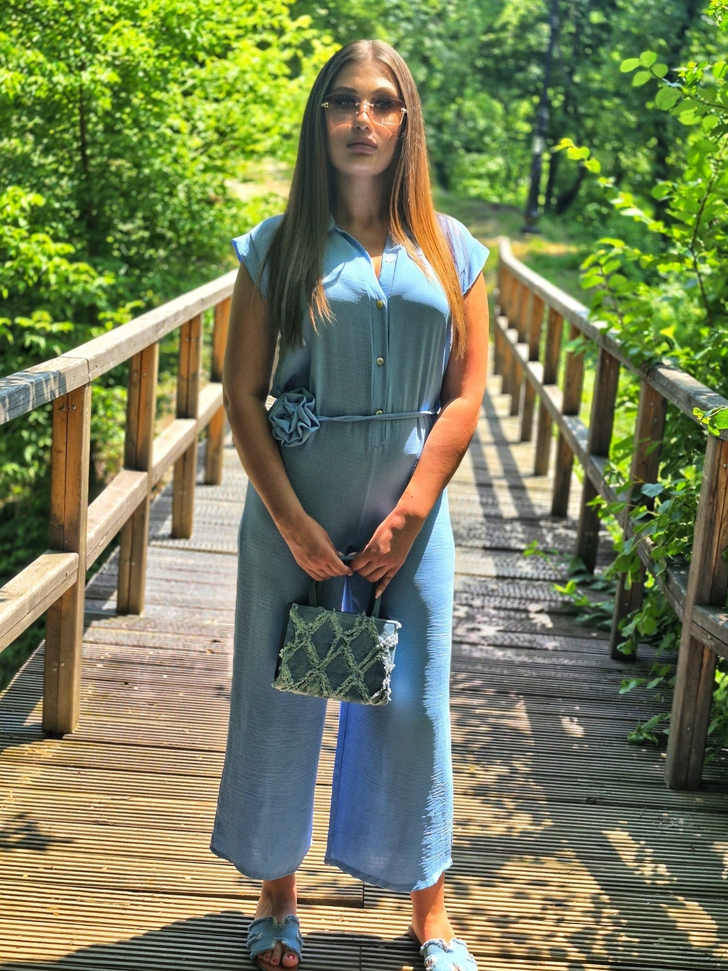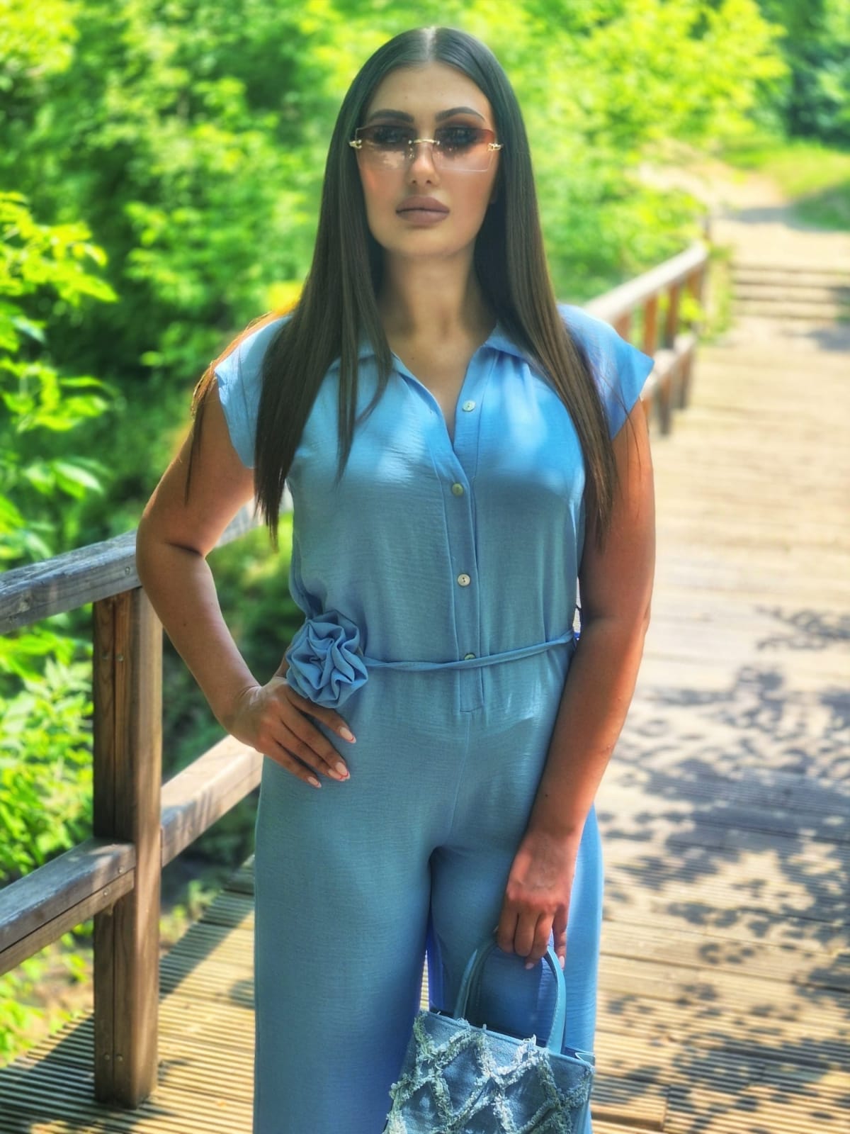 Eleganta si confort intr-o singura piesa. Aceasta salopeta din vascoza este alegerea ideala pentru zilele calde, datorita croiului lejer si materialului fluid. Designul este completat de un cordon in talie cu detaliu tip floare, care subliniaza frumos silueta. Se inchide cu nasturi in fata si poate fi purtata atat casual, cat si la evenimente relaxate.