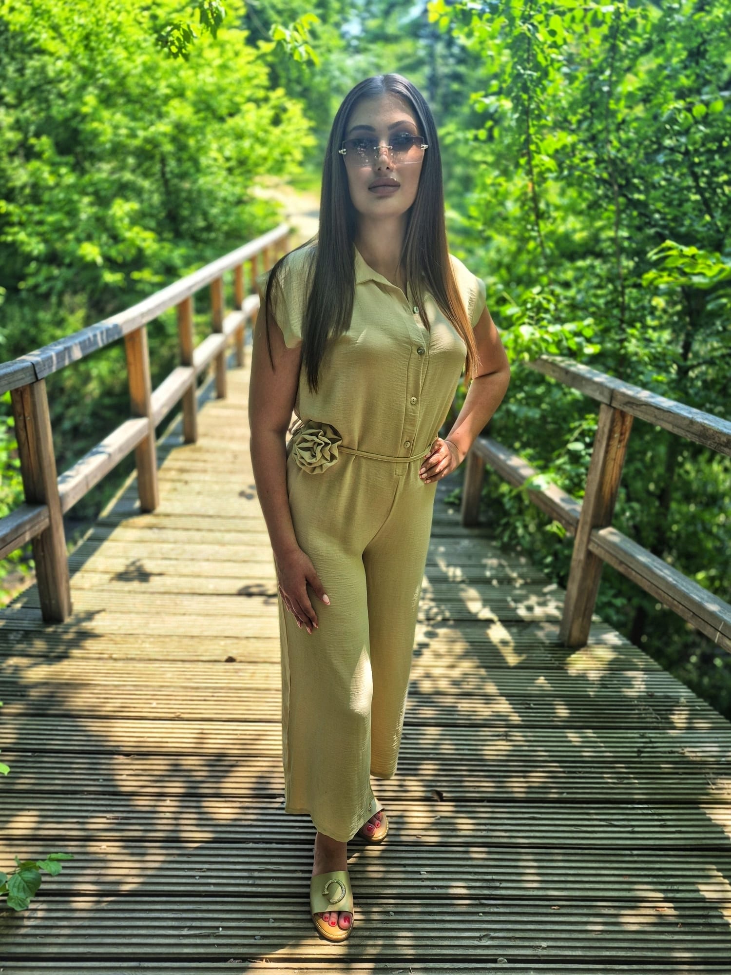 Eleganta si confort intr-o singura piesa. Aceasta salopeta din vascoza este alegerea ideala pentru zilele calde, datorita croiului lejer si materialului fluid. Designul este completat de un cordon in talie cu detaliu tip floare, care subliniaza frumos silueta. Se inchide cu nasturi in fata si poate fi purtata atat casual, cat si la evenimente relaxate.