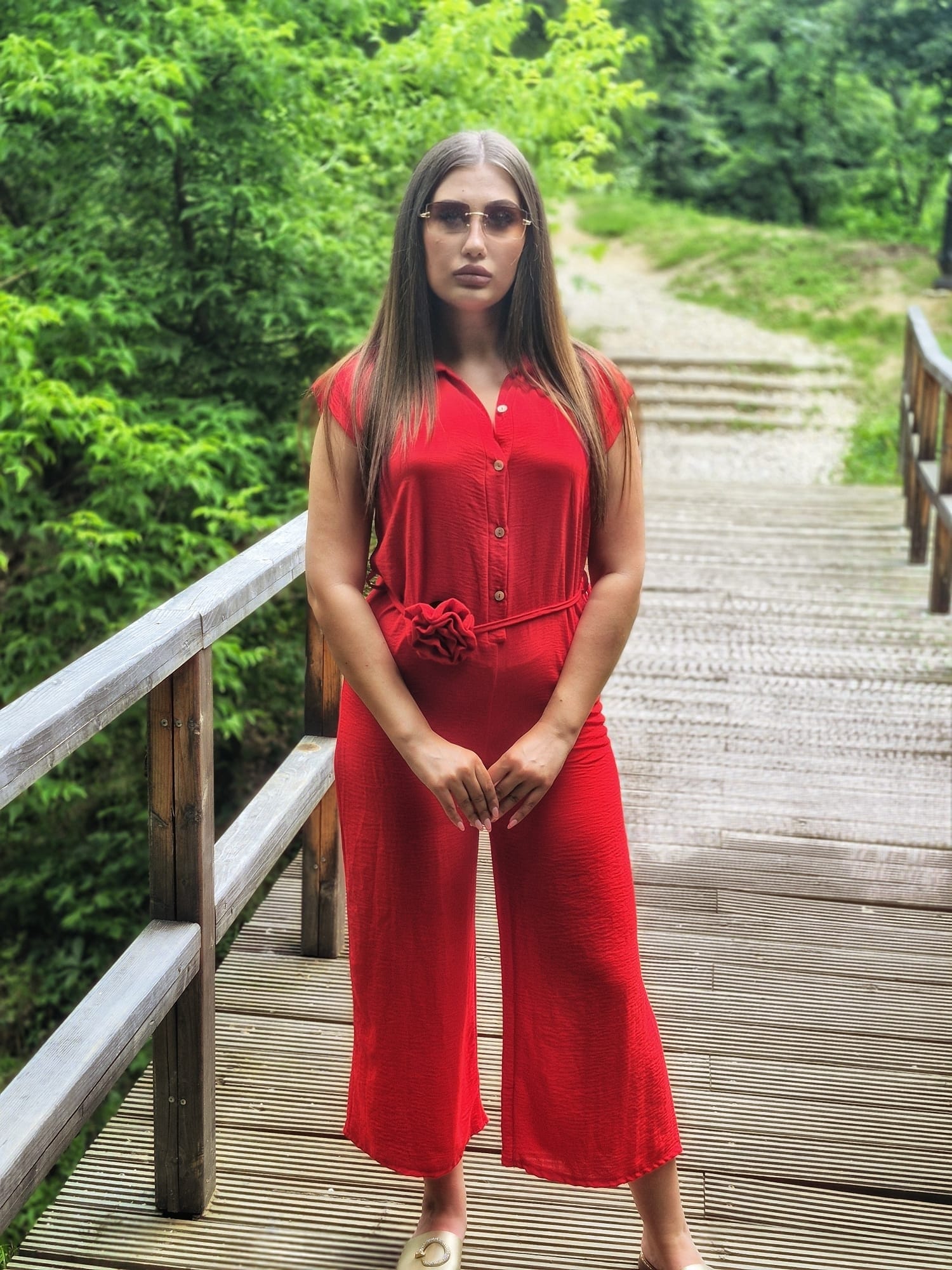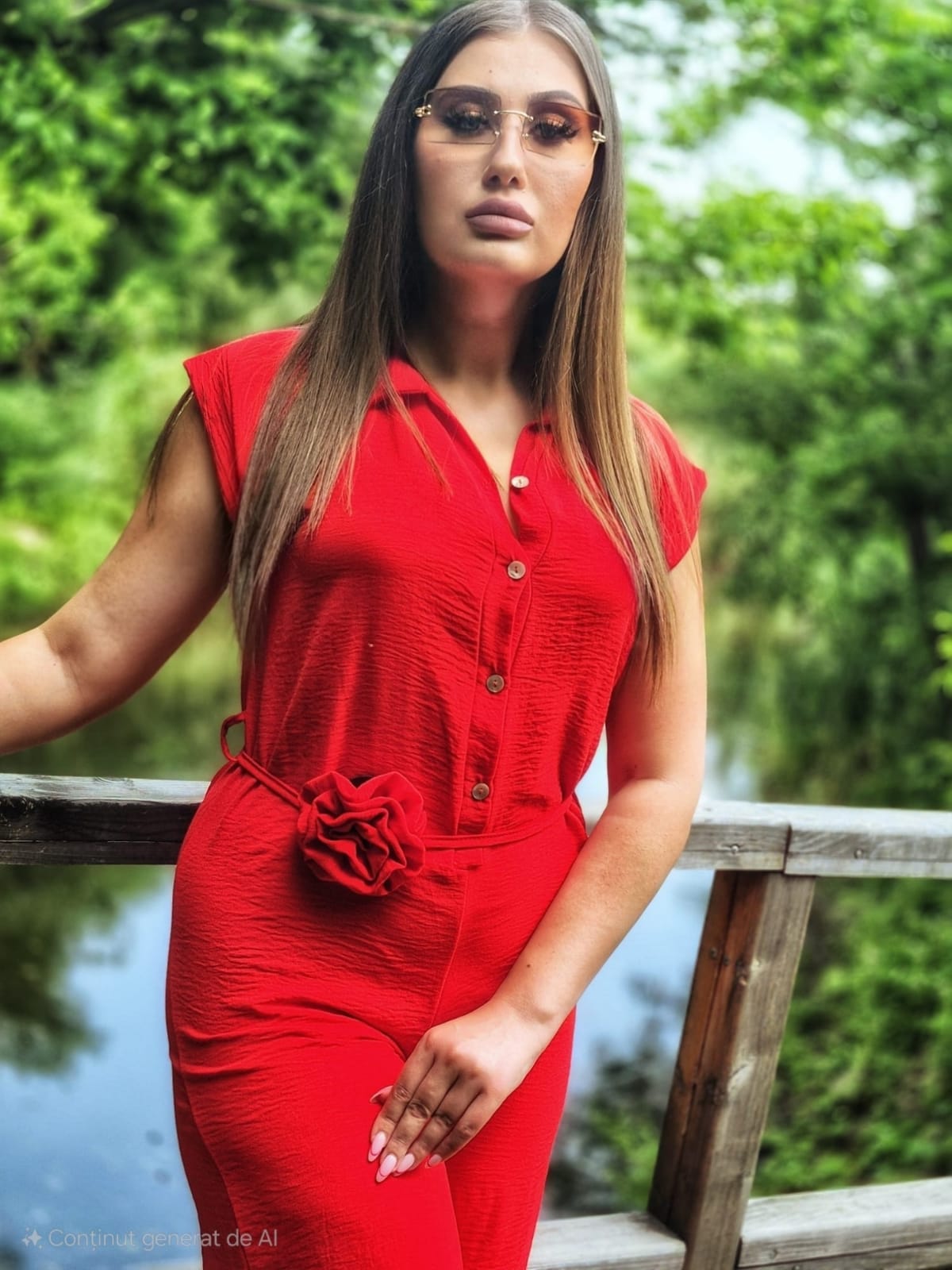 Eleganta si confort intr-o singura piesa. Aceasta salopeta din vascoza este alegerea ideala pentru zilele calde, datorita croiului lejer si materialului fluid. Designul este completat de un cordon in talie cu detaliu tip floare, care subliniaza frumos silueta. Se inchide cu nasturi in fata si poate fi purtata atat casual, cat si la evenimente relaxate.