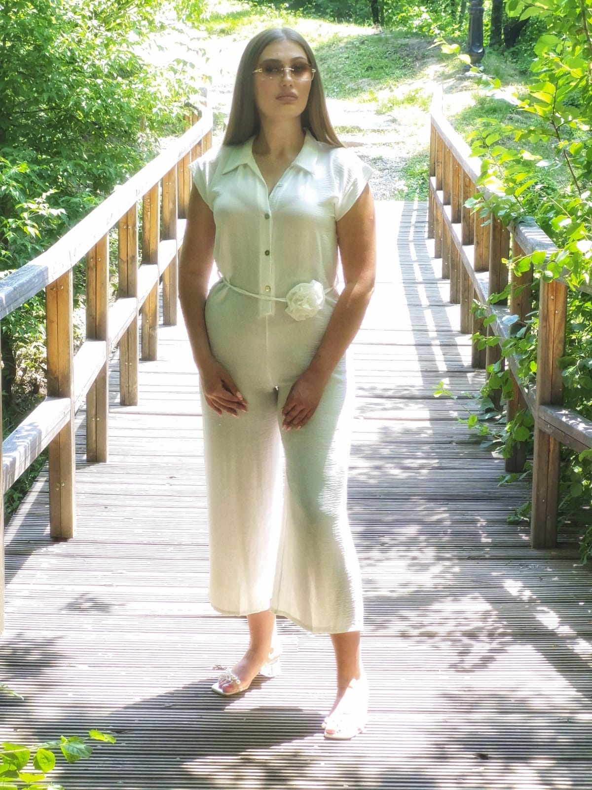 Eleganta si confort intr-o singura piesa. Aceasta salopeta din vascoza este alegerea ideala pentru zilele calde, datorita croiului lejer si materialului fluid. Designul este completat de un cordon in talie cu detaliu tip floare, care subliniaza frumos silueta. Se inchide cu nasturi in fata si poate fi purtata atat casual, cat si la evenimente relaxate.